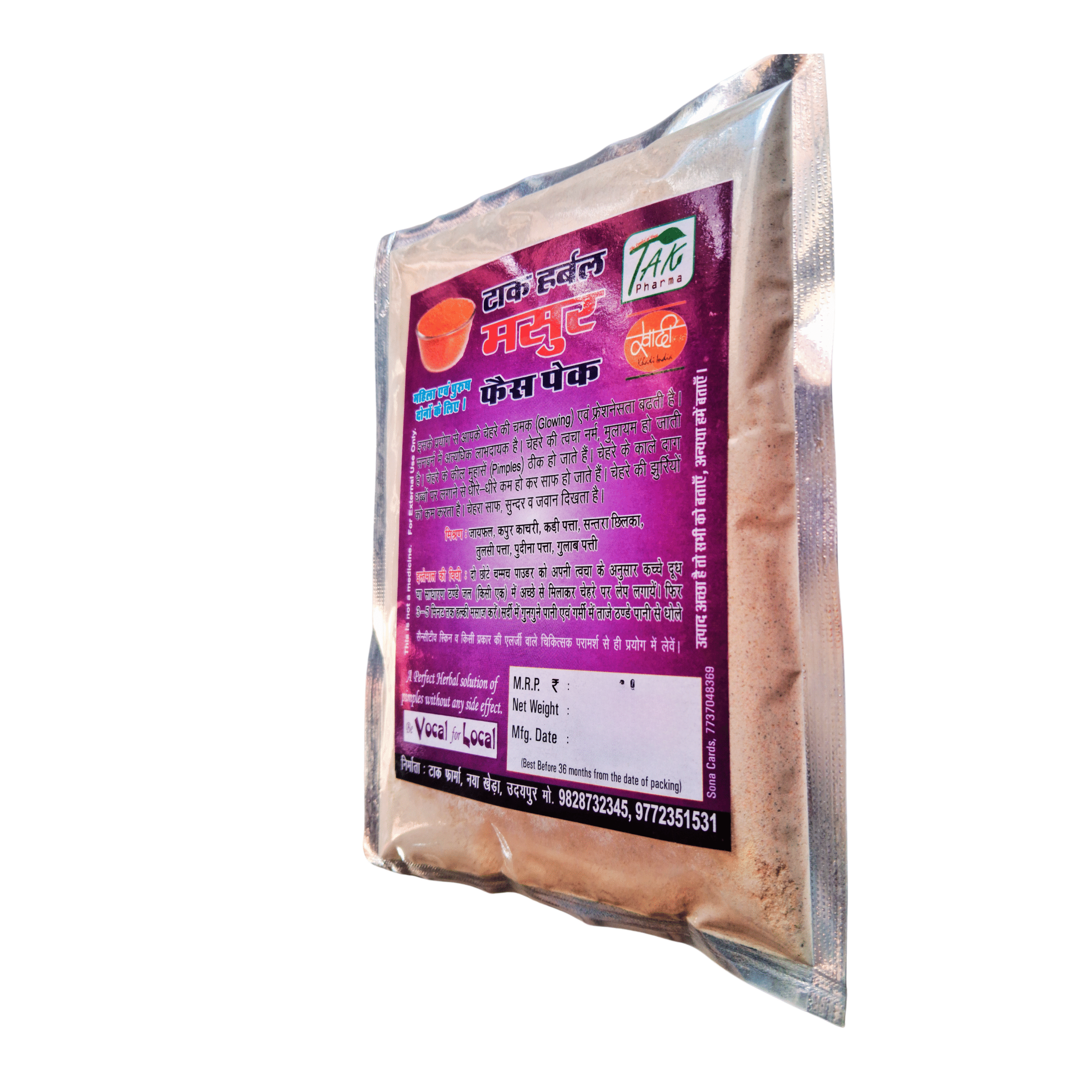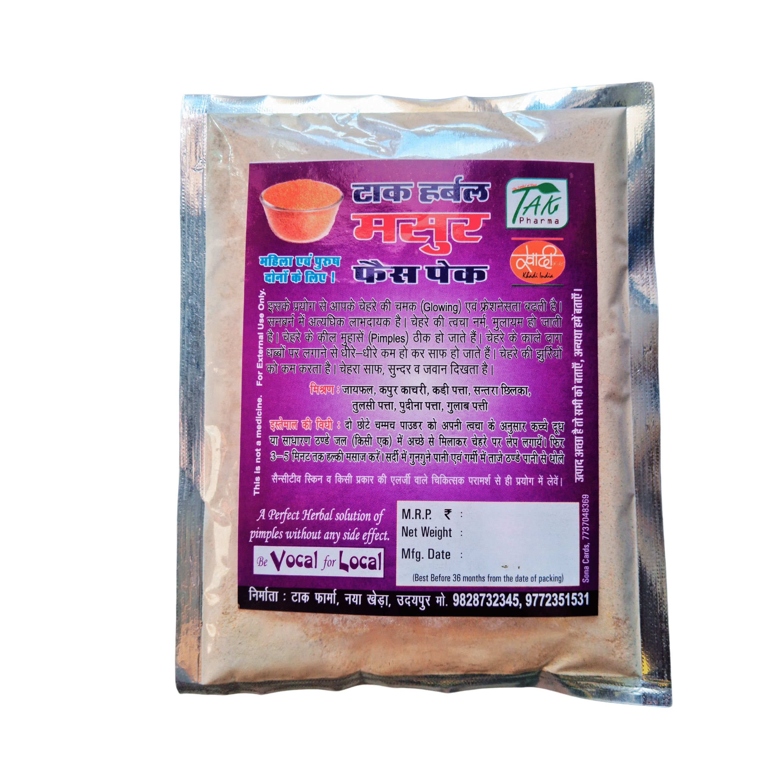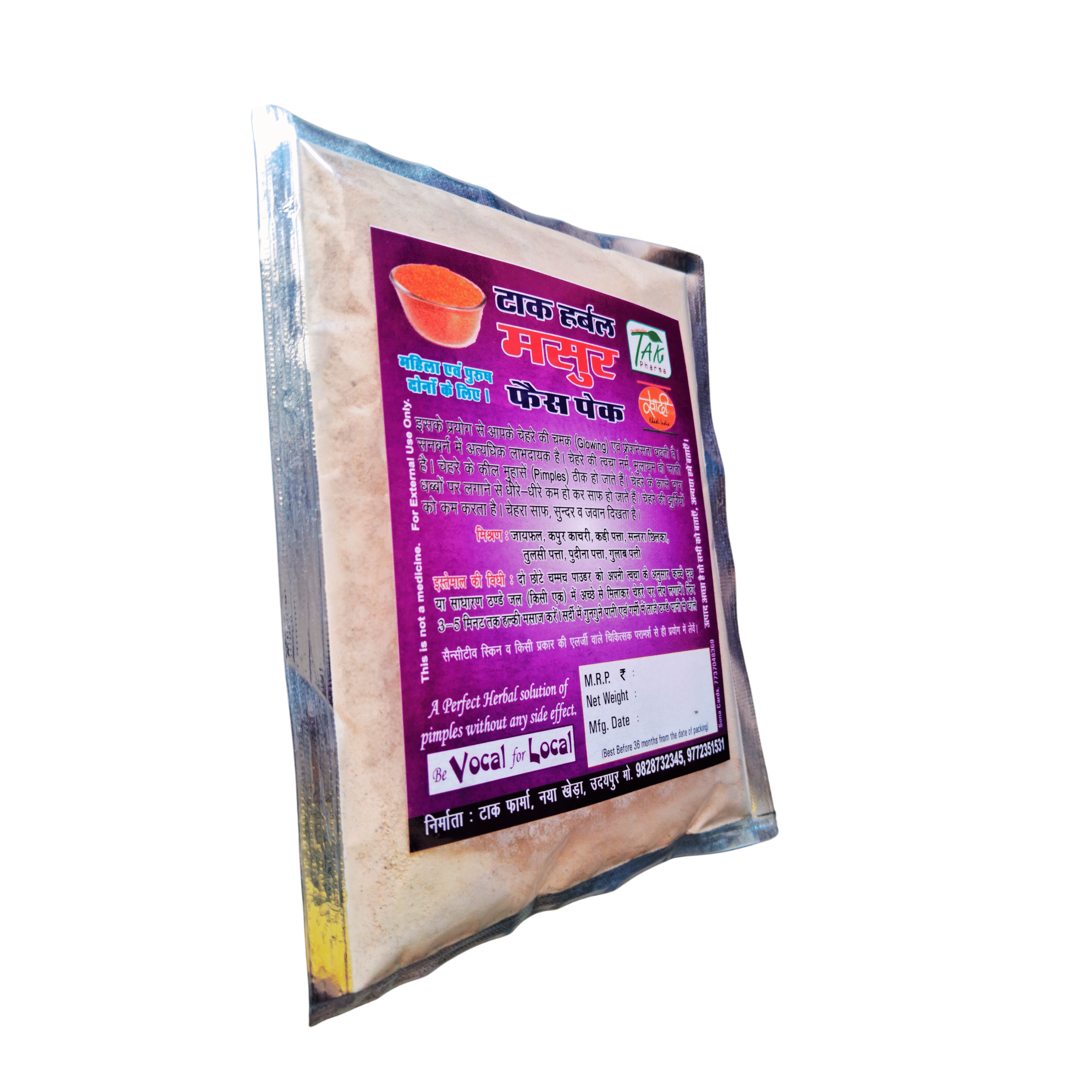 What sets Tak Pharma’s Masur Dal Face Pack apart is our commitment to authenticity and purity. All herbs are handpicked directly from trusted farmers, sun-dried under hygienic conditions, and ground in-house to retain their essential oils, nutrients, and healing properties. We do not add any synthetic preservatives, fragrances, or chemicals—just the pure power of nature in every spoonful.